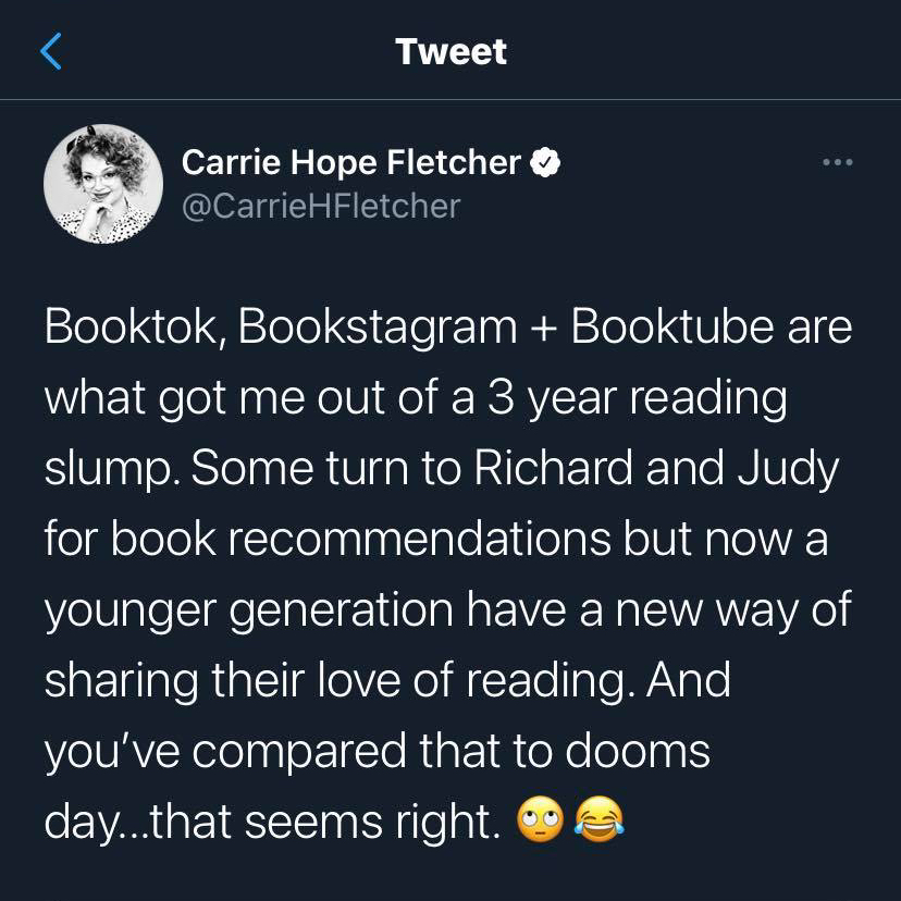 This belief is rooted in centuries-old classism – that to read and digest a book, you have to fit certain criteria. In previous worlds, that criteria would have been your social class, your education or your gender – in today’s world, clearly many believe that criteria is not being on TikTok. And what does that say about who we believe is entitled to literature?