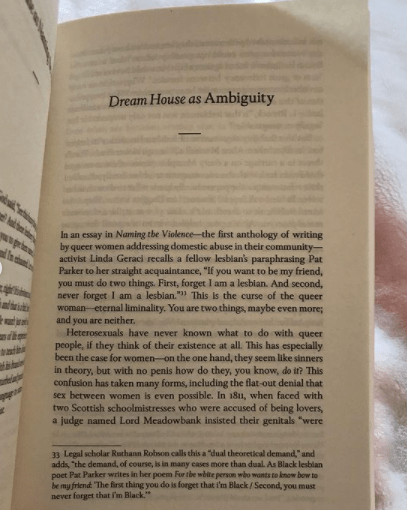In her chapter Dream House as Ambiguity (p.157), Machado discusses the ‘paradox’ that talking about domestic abuse in LGBTQ+ contexts brings forth. She references a real life case in which a female abuser failed to be sentenced for her crime for the simple fact that she was a woman, and that it was believed women could not be perpetrators of abuse. Additionally the case was shrouded in shame.