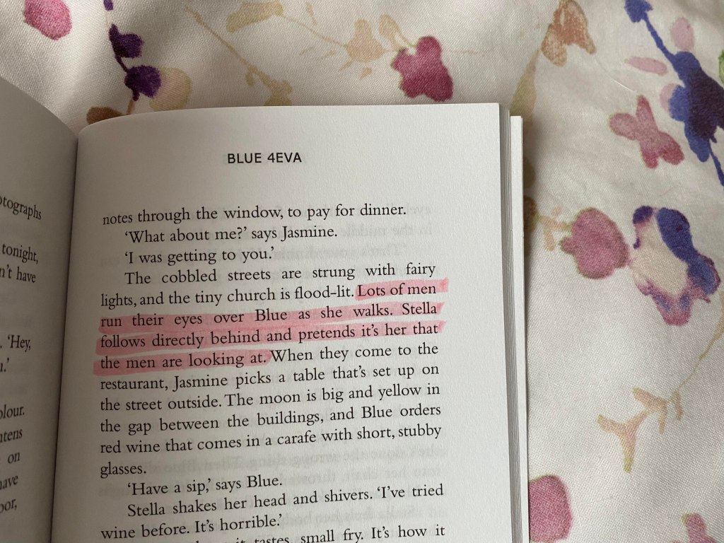While Stella seeks Blue’s friendship, there were moments which seemed to zoom in on Blue’s body from Stella’s perceptive, making me question whether Stella felt more than a sisterly type of love towards her older friend. Her body is described through the tight, revealing clothes Blue wears which Stella seems to cling to and analyse in silent awe: “The door opens, and there’s Blue, dressed in a pair of fluorescent orange bikini bottoms and a white crop top, her dark nipples just visible underneath.” As Stella is only twelve, I questioned whether her thoughts towards Blue purposefully had a sexual energy, and perhaps was just the exploration of Stella’s curiosity towards a growing woman’s body. But when I read Sam’s reflection on the story, she said that Blue 4eva “engages with sexuality too, particularly with queerness, in a subtle way that I found interesting to write.”